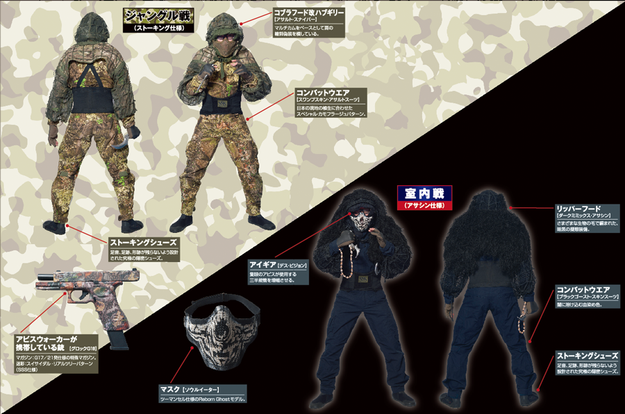 人間の脳は錯覚をする。人は目で何かを見てはいない。脳で見ているのだ。脳が認識しなければそれは見えていないことと同意義である。認識を困難にする色彩パターン、人と認識するためのトライアングル(頭頂部と両肩を結ぶ線)を隠すシルエット。このアビスギリーと特殊なムーブメントが融合したとき、人はそれを人とは認識できなくなる。そして、それが敵の判断を鈍らせ命に手の届く刹那をもたらす。
